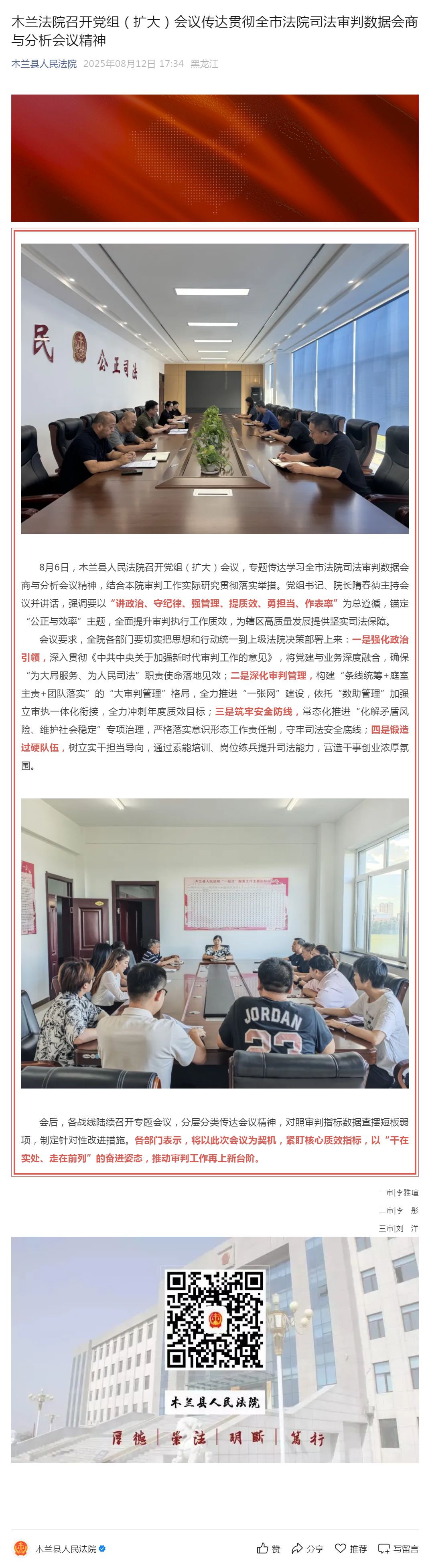 木兰法院召开党组(扩大)会议传达贯彻全市法院司法审判数据会商与分析会议精神