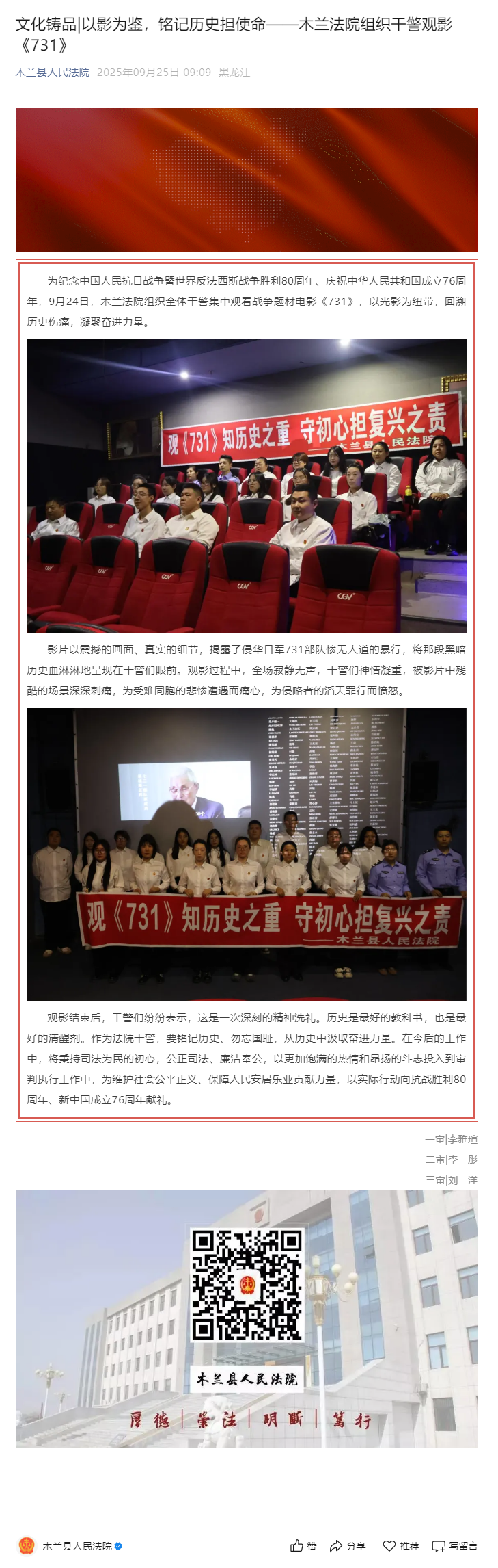 文化铸品_以影为鉴,铭记历史担使命——木兰法院组织干警观影《731》