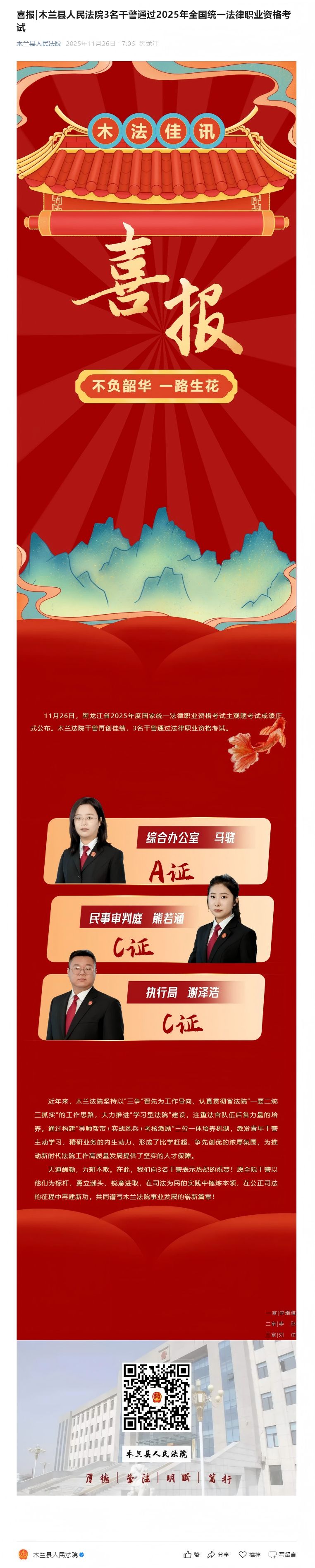 喜报_木兰县人民法院3名干警通过2025年全国统一法律职业资格考试