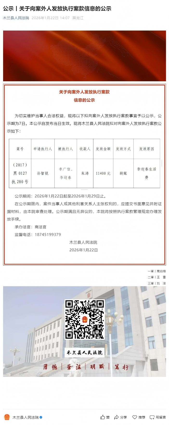 公示丨关于向案外人发放执行案款信息的公示