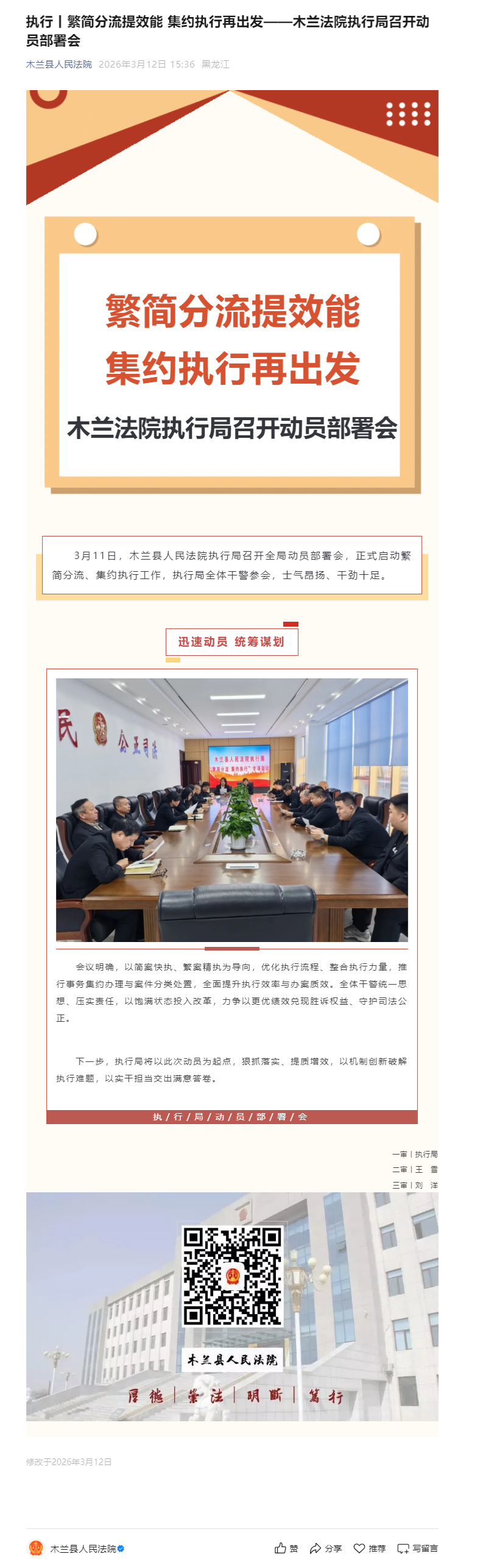 执行丨繁简分流提效能 集约执行再出发——木兰法院执行局召开动员部署会