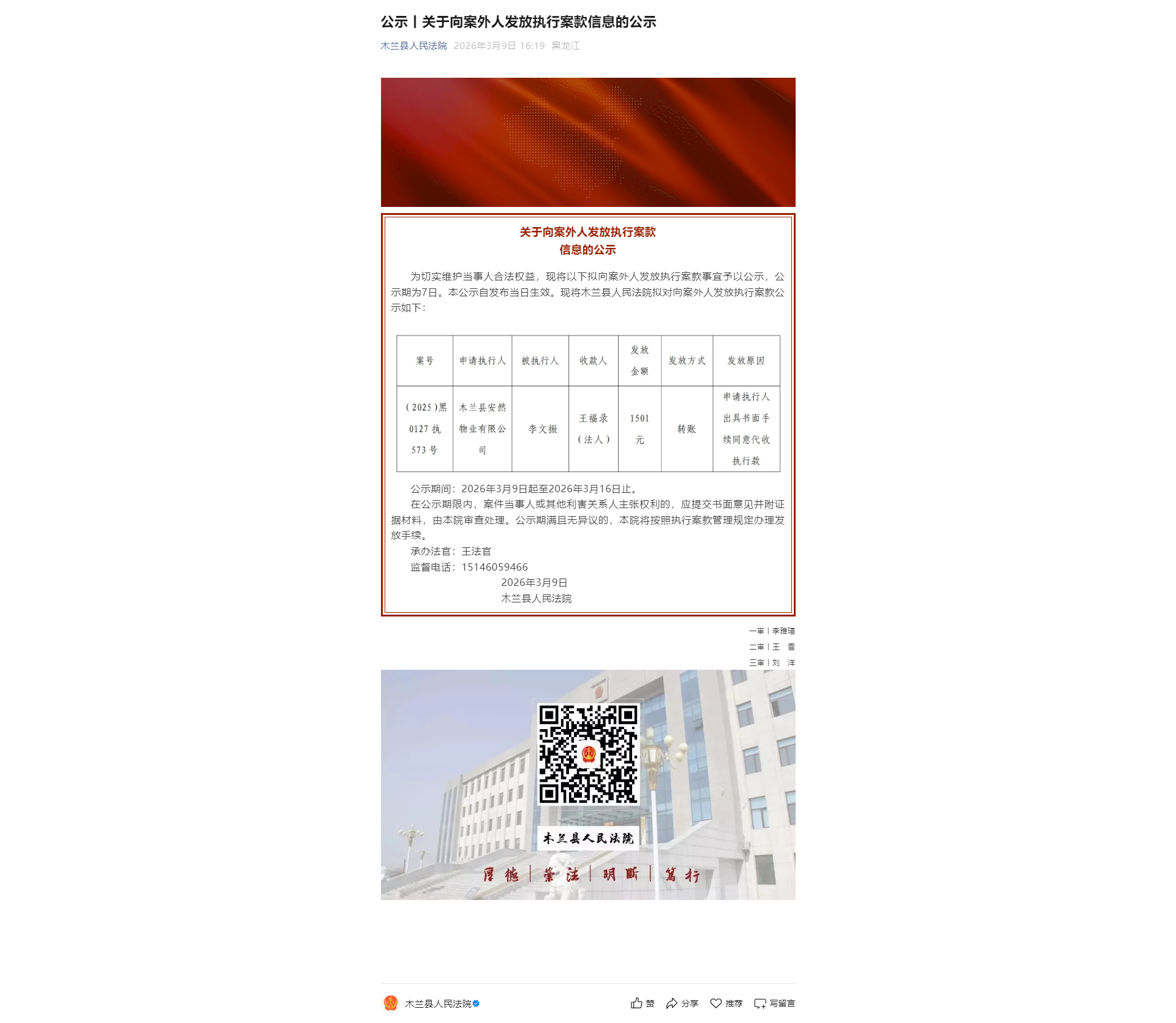 公示丨关于向案外人发放执行案款信息的公示